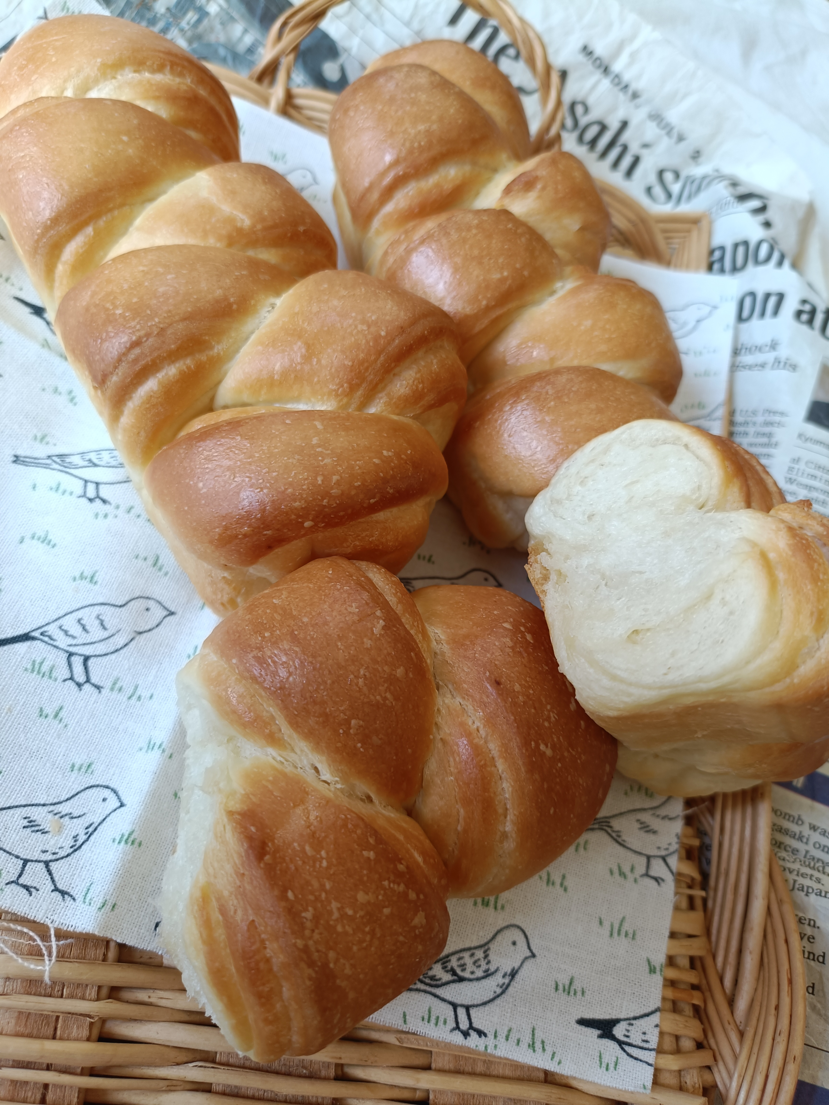 ねじってくるくる巻いた成形で、平べったく焼くことで、生クリームブレッドとはまた違った食感になっています