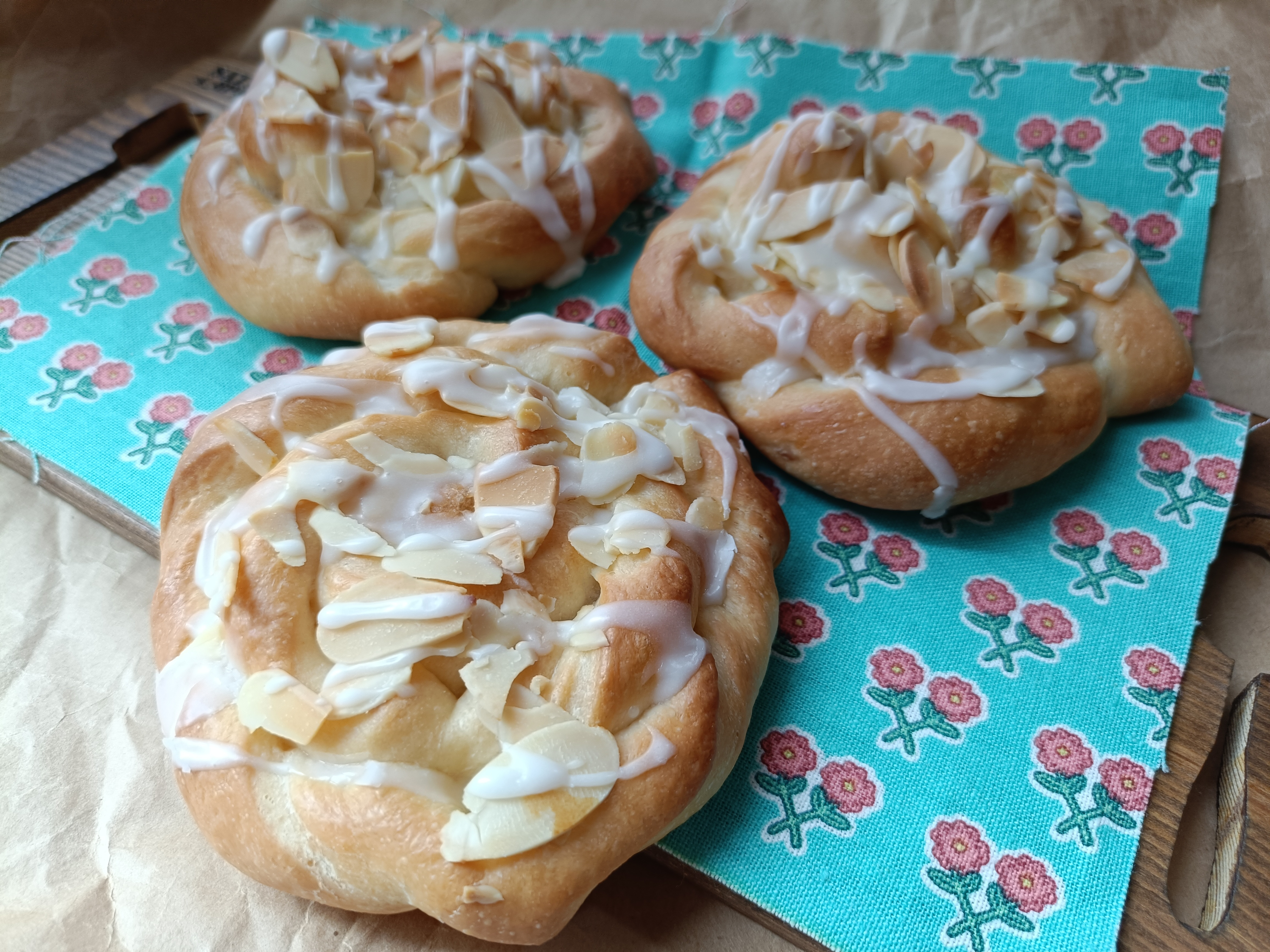 表面にはアーモンドをふりかけ、仕上げにアイシングをして、おやつパンにしましょう
